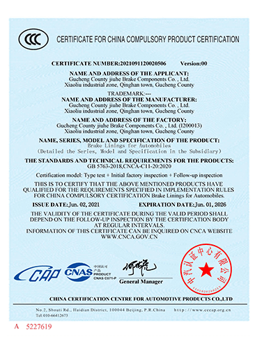 故城縣九和制動元件有限公司主導(dǎo)產(chǎn)品為:汽車剎車片、裝載機剎車片。剎車片采用高溫高壓的熱壓工藝、設(shè)備、生產(chǎn)線、能保證質(zhì)量穩(wěn)定,有為主機廠配套生產(chǎn)的經(jīng)驗和能力。劉如根商標(biāo)是公司主要商標(biāo),公司還有飛人標(biāo)牌、蛟龍牌、橫空出世等品牌!公司有多個剎車片檢驗設(shè)備,剎車片摩擦性能定速摩擦試驗機與國家非金屬礦制品檢驗中心試驗機是同公司生產(chǎn)的同型號試驗機。拖曳試驗機2020年通過中國建材檢驗集團咸陽有限公司檢驗合格,剪切試驗機;布氏和洛氏試驗機。2021年公司通過國家強制性CCC認證、通過過19001-2000idt ISO 9001:2015質(zhì)量體系認證,IATF16949認證,歐盟Emark認證。剎車片執(zhí)行GB/T11834-2011、GB 5763-2018標(biāo)準(zhǔn)。公司產(chǎn)品先后曾給山東臨工、徐工、卡特彼勒(山工)、徐州美馳車橋公司、肥城金城橋公司,山東路通橋箱科技公司,山東博士樂公司,郯城郯液公司,日照金···